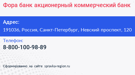 Фора-банк, акционерный коммерческий банк по адресу 191036, Россия, Санкт-Петербург, Невский проспект, 120 в дальнейшем Организация, размещена в следующих категориях: