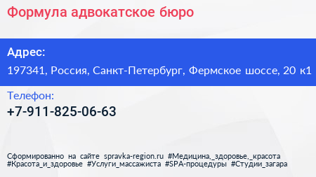 Формула, адвокатское бюро по адресу 197341, Россия, Санкт-Петербург, Фермское шоссе, 20 к1 в дальнейшем Организация, размещена в следующих категориях: