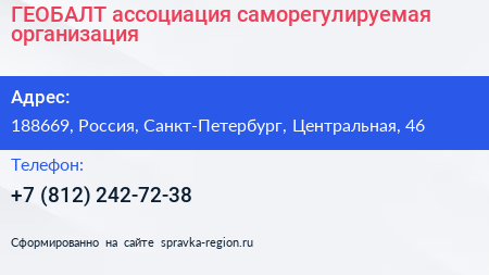 ГЕОБАЛТ, ассоциация саморегулируемая организация по адресу 188669, Россия, Санкт-Петербург, Центральная, 46 в дальнейшем Организация, размещена в следующих категориях: