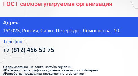 ГОСТ, саморегулируемая организация по адресу 191023, Россия, Санкт-Петербург, Ломоносова, 10 в дальнейшем Организация, размещена в следующих категориях: