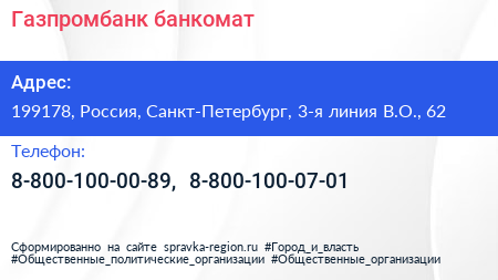 Газпромбанк, банкомат по адресу 199178, Россия, Санкт-Петербург, 3-я линия В.О., 62 в дальнейшем Организация, размещена в следующих категориях: