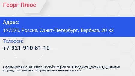 Георг Плюс по адресу 197375, Россия, Санкт-Петербург, Вербная, 20 к2 в дальнейшем Организация, размещена в следующих категориях: