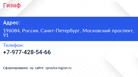 Гизаф по адресу 196084, Россия, Санкт-Петербург, Московский проспект, 91 в дальнейшем Организация, размещена в следующих категориях: