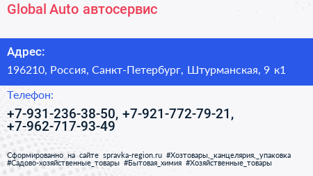 Global Auto, автосервис по адресу 196210, Россия, Санкт-Петербург, Штурманская, 9 к1 в дальнейшем Организация, размещена в следующих категориях: