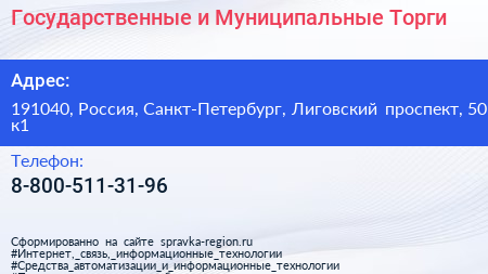 Государственные и Муниципальные Торги по адресу 191040, Россия, Санкт-Петербург, Лиговский проспект, 50 к1 в дальнейшем Организация, размещена в следующих категориях: