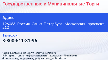 Государственные и Муниципальные Торги по адресу 196066, Россия, Санкт-Петербург, Московский проспект, 212 в дальнейшем Организация, размещена в следующих категориях: