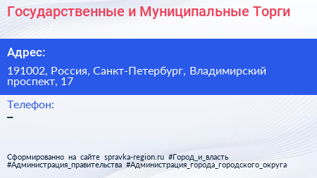 Государственные и Муниципальные Торги по адресу 191002, Россия, Санкт-Петербург, Владимирский проспект, 17 в дальнейшем Организация, размещена в следующих категориях:
