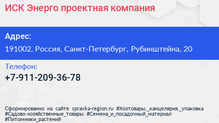 ИСК-Энерго, проектная компания по адресу 191002, Россия, Санкт-Петербург, Рубинштейна, 20 в дальнейшем Организация, размещена в следующих категориях: