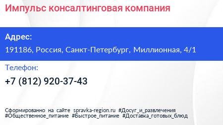 Импульс, консалтинговая компания по адресу 191186, Россия, Санкт-Петербург, Миллионная, 4/1 в дальнейшем Организация, размещена в следующих категориях: