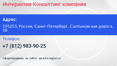 Интерактив-Консалтинг, компания по адресу 195253, Россия, Санкт-Петербург, Салтыковская дорога, 18 в дальнейшем Организация, размещена в следующих категориях: