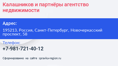 Калашников и партнёры, агентство недвижимости по адресу 195213, Россия, Санкт-Петербург, Новочеркасский проспект, 58 в дальнейшем Организация, размещена в следующих категориях: