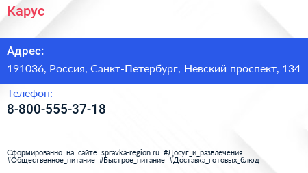 Карус по адресу 191036, Россия, Санкт-Петербург, Невский проспект, 134 в дальнейшем Организация, размещена в следующих категориях: