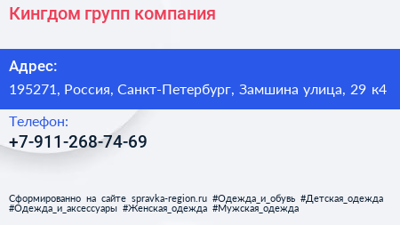 Кингдом групп, компания по адресу 195271, Россия, Санкт-Петербург, Замшина улица, 29 к4 в дальнейшем Организация, размещена в следующих категориях: