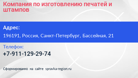Компания по изготовлению печатей и штампов по адресу 196191, Россия, Санкт-Петербург, Бассейная, 21 в дальнейшем Организация, размещена в следующих категориях: