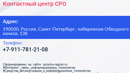 Контактный центр СРО по адресу 190020, Россия, Санкт-Петербург, набережная Обводного канала, 138 в дальнейшем Организация, размещена в следующих категориях: