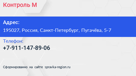 Контроль-М по адресу 195027, Россия, Санкт-Петербург, Пугачёва, 5-7 в дальнейшем Организация, размещена в следующих категориях: