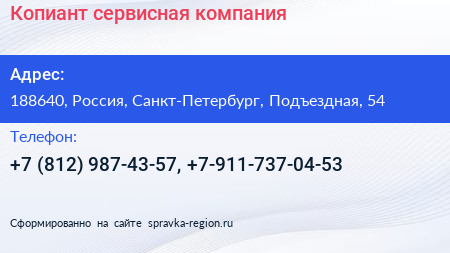 Копиант, сервисная компания по адресу 188640, Россия, Санкт-Петербург, Подъездная, 54 в дальнейшем Организация, размещена в следующих категориях: