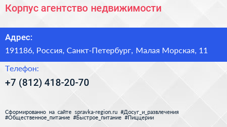 Корпус, агентство недвижимости по адресу 191186, Россия, Санкт-Петербург, Малая Морская, 11 в дальнейшем Организация, размещена в следующих категориях: