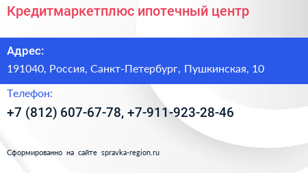 Кредитмаркетплюс, ипотечный центр по адресу 191040, Россия, Санкт-Петербург, Пушкинская, 10 в дальнейшем Организация, размещена в следующих категориях: