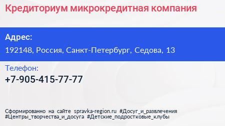 Кредиториум, микрокредитная компания по адресу 192148, Россия, Санкт-Петербург, Седова, 13 в дальнейшем Организация, размещена в следующих категориях: