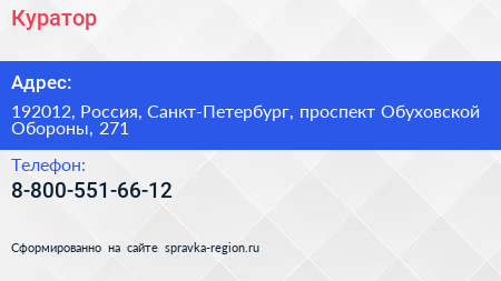 Куратор по адресу 192012, Россия, Санкт-Петербург, проспект Обуховской Обороны, 271 в дальнейшем Организация, размещена в следующих категориях: