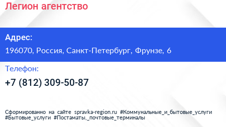 Легион, агентство по адресу 196070, Россия, Санкт-Петербург, Фрунзе, 6 в дальнейшем Организация, размещена в следующих категориях: