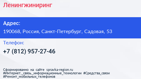 Ленингжиниринг по адресу 190068, Россия, Санкт-Петербург, Садовая, 53 в дальнейшем Организация, размещена в следующих категориях: