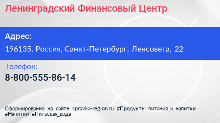 Ленинградский Финансовый Центр по адресу 196135, Россия, Санкт-Петербург, Ленсовета, 22 в дальнейшем Организация, размещена в следующих категориях: