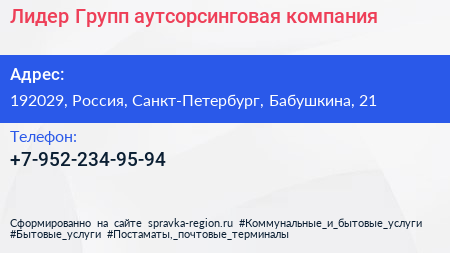 Лидер Групп, аутсорсинговая компания по адресу 192029, Россия, Санкт-Петербург, Бабушкина, 21 в дальнейшем Организация, размещена в следующих категориях: