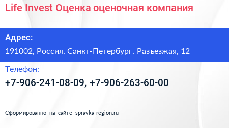 Life Invest Оценка, оценочная компания по адресу 191002, Россия, Санкт-Петербург, Разъезжая, 12 в дальнейшем Организация, размещена в следующих категориях: