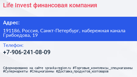 Life Invest, финансовая компания по адресу 191186, Россия, Санкт-Петербург, набережная канала Грибоедова, 19 в дальнейшем Организация, размещена в следующих категориях: