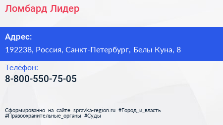 Ломбард Лидер по адресу 192238, Россия, Санкт-Петербург, Белы Куна, 8 в дальнейшем Организация, размещена в следующих категориях: