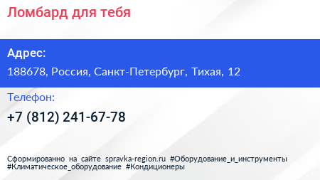 Ломбард для тебя по адресу 188678, Россия, Санкт-Петербург, Тихая, 12 в дальнейшем Организация, размещена в следующих категориях: