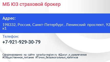 МБ-ЮЗ, страховой брокер по адресу 198332, Россия, Санкт-Петербург, Ленинский проспект, 92 к1 в дальнейшем Организация, размещена в следующих категориях: