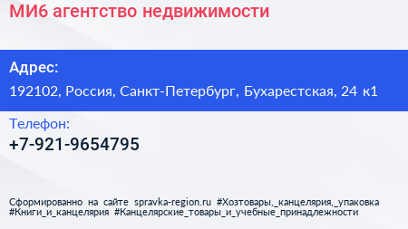 МИ6, агентство недвижимости по адресу 192102, Россия, Санкт-Петербург, Бухарестская, 24 к1 в дальнейшем Организация, размещена в следующих категориях:
