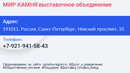 МИР КАМНЯ, выставочное объединение по адресу 191011, Россия, Санкт-Петербург, Невский проспект, 35 в дальнейшем Организация, размещена в следующих категориях: