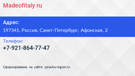 Madeofitaly.ru по адресу 197341, Россия, Санкт-Петербург, Афонская, 2 в дальнейшем Организация, размещена в следующих категориях: