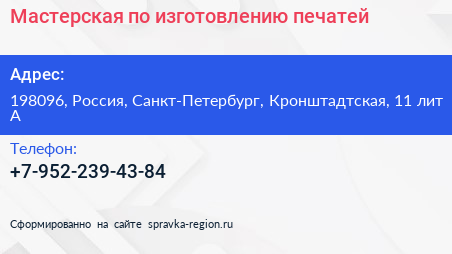 Мастерская по изготовлению печатей по адресу 198096, Россия, Санкт-Петербург, Кронштадтская, 11 лит А в дальнейшем Организация, размещена в следующих категориях: