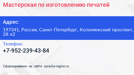 Мастерская по изготовлению печатей по адресу 197341, Россия, Санкт-Петербург, Коломяжский проспект, 28 к2 в дальнейшем Организация, размещена в следующих категориях: