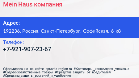 Mein Haus, компания по адресу 192236, Россия, Санкт-Петербург, Софийская, 6 к8 в дальнейшем Организация, размещена в следующих категориях: