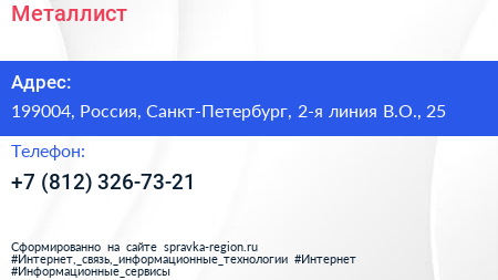 Металлист по адресу 199004, Россия, Санкт-Петербург, 2-я линия В.О., 25 в дальнейшем Организация, размещена в следующих категориях: