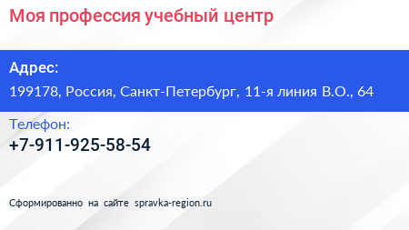 Моя профессия, учебный центр по адресу 199178, Россия, Санкт-Петербург, 11-я линия В.О., 64 в дальнейшем Организация, размещена в следующих категориях: