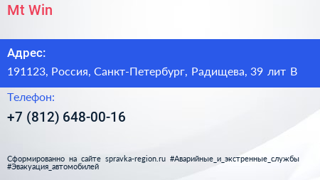 Mt Win по адресу 191123, Россия, Санкт-Петербург, Радищева, 39 лит В в дальнейшем Организация, размещена в следующих категориях:
