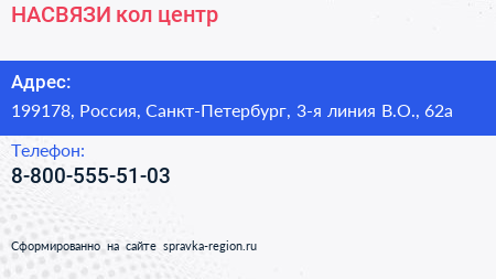 НАСВЯЗИ, кол-центр по адресу 199178, Россия, Санкт-Петербург, 3-я линия В.О., 62а в дальнейшем Организация, размещена в следующих категориях:
