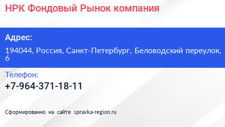 НРК Фондовый Рынок, компания по адресу 194044, Россия, Санкт-Петербург, Беловодский переулок, 6 в дальнейшем Организация, размещена в следующих категориях:
