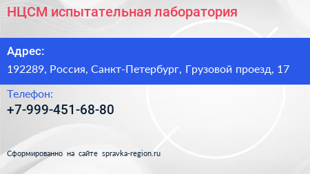 НЦСМ, испытательная лаборатория по адресу 192289, Россия, Санкт-Петербург, Грузовой проезд, 17 в дальнейшем Организация, размещена в следующих категориях:
