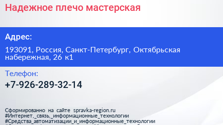 Надежное плечо, мастерская по адресу 193091, Россия, Санкт-Петербург, Октябрьская набережная, 26 к1 в дальнейшем Организация, размещена в следующих категориях: