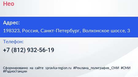 Нео по адресу 198323, Россия, Санкт-Петербург, Волхонское шоссе, 3 в дальнейшем Организация, размещена в следующих категориях: