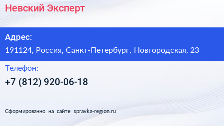 Невский Эксперт по адресу 191124, Россия, Санкт-Петербург, Новгородская, 23 в дальнейшем Организация, размещена в следующих категориях:
