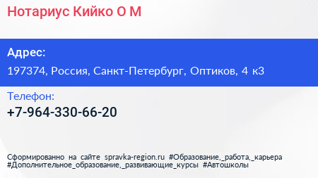 Нотариус Кийко О.М. по адресу 197374, Россия, Санкт-Петербург, Оптиков, 4 к3 в дальнейшем Организация, размещена в следующих категориях: